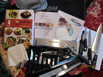 I slept better last night. I started a little too late to feel great today but at least I slept! This morning I walked to 711 for coffee before my carpool got here. About halfway there I tripped in my clumsy chef shoes. I threw one hip and shoulder out of whack and they are sooooooo sore! I skinned a hand and an elbow and scraped the heck out of one knee! The knee and elbow are turning darker and darker. When was the last time I skinned my knee? I'm going to be black and blue tomorrow! And stiff! Today I am very thankful for Tylenol! School was cool. I don't want to say that I'm bored because that's so negative and I don't want to have a negative attitude toward school. I like it. I really do. We went over all of the small equipment in the kitchen and through each piece of our knife kits. Lecture time was mostly the history of our industry--Careme, Escoffier, and so on. It is very interesting and I took thorough notes the first time! I had a hard time hearing today (battery might be dead) and might have been less bored if I could have followed better. Standing around achy and too tired didn't help. More than anything, I don't want to come across to my instructors or my classmates as a know-it-all. That's annoying! I obviously do not know everything or think I do. I'm just saying that I very recently covered the materials that we are going over right now and I still remember them. We start knife cuts Thursday. I never did master that so it will do me a lot of good! I sure need practice! I tourned a potato to show Julianne Sunday. It was horrible but not even close to as horrible as my first few in class. I really have to start eating before school! We won't be cooking anything to actually eat for a few weeks and the smells from the other classes are soooooo gooooood!